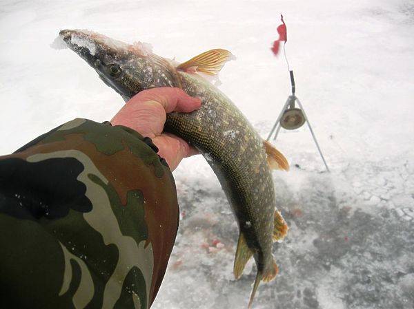 Подойдя к снасти, подсекаю и вываживаю из-подо льда щучку кило на полтора. Для маленькой речушки очень даже неплохо. А вскоре поднялся ещё один флажок. Эта вторая щучка была в этот день последней, но как раз к месту – на заливное ко дню рождения. К двум щукам у меня и килограмма два окуньков есть в холодильнике.