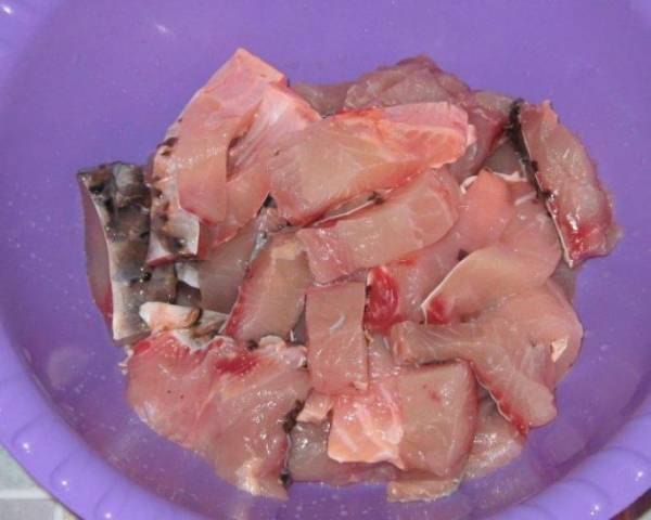 • Тушка рыбы чистится и избавляется от внутренностей, после чего режется на кусочки, толщиной до 4-х сантиметров.