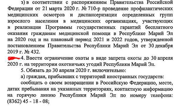 "Учитывая эпидемиологическую ситуацию в стране, с целью предупреждения распространения заболеваний коронавирусной инфекцией среди населения Вологодской области, принято решение установить запрет любительской и спортивной охоты на бурого медведя, водоплавающую и боровую дичь в период весенней охоты 2020 года на территории охотничьих угодий Вологодской области", — цитирует пресс-служба начальника областного департамента по охране, контролю и регулированию объектов животного мира Олега Кислицына.