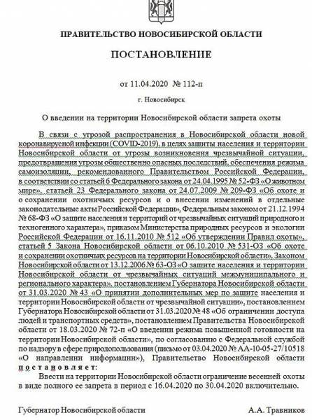 11 апреля подписан документ о закрытии весенней охоты в Новосибирской области.