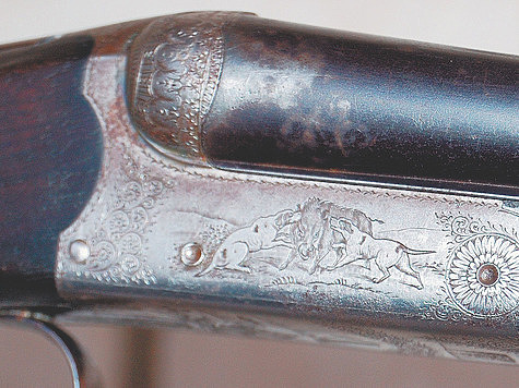 Выделяется она гравировкой на колодке, которая привлекает внимание сценками охоты на животных с собаками: справа на кабана, снизу на оленя, слева на волка. Завершает декор ружья серебряный медальон, врезанный в нижний гребень ложи.